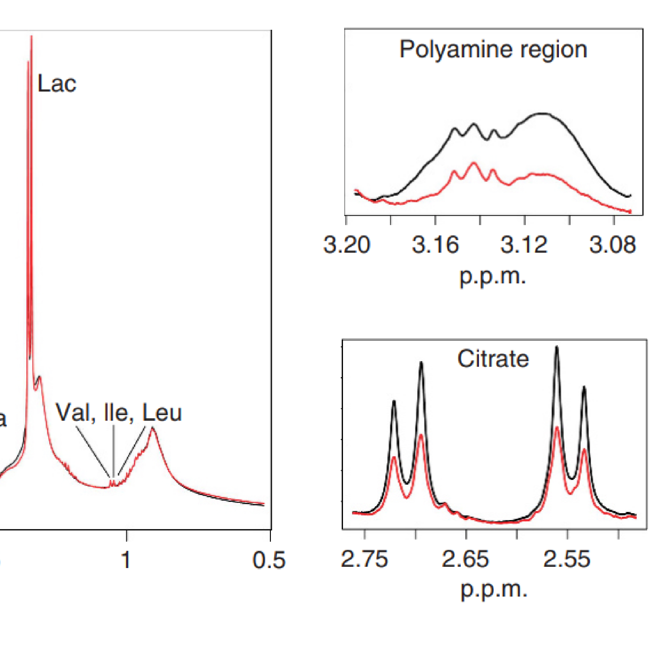 Using ex vivo magnetic resonance spectroscopy, we find reduced levels of citrate and spermine in prostate cancer tumors. Low spermine and high levels of the ratio of choline and creatine to spermine in primary tumors were associated with reduced recurrence-free survival after radical prostatectomy.