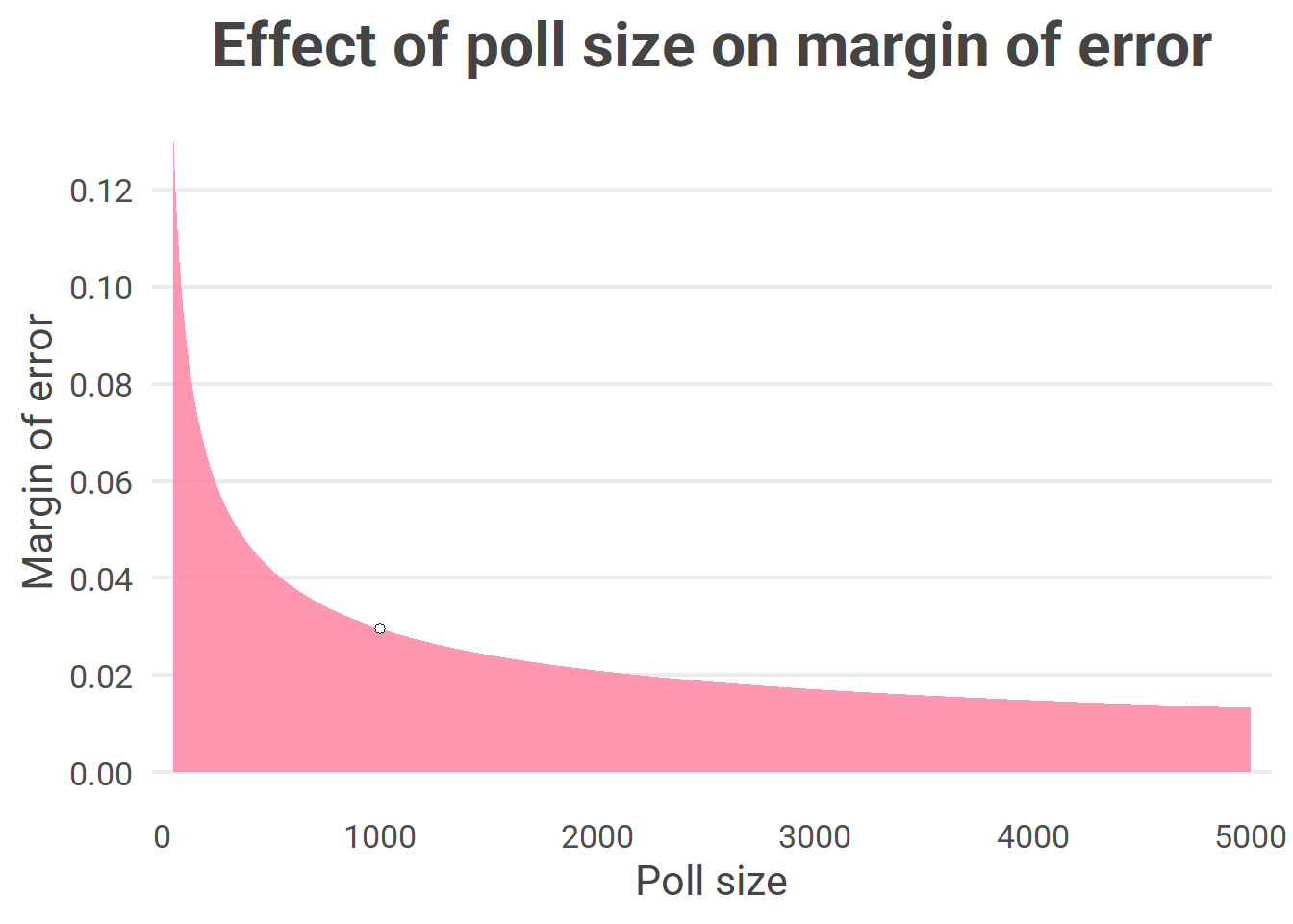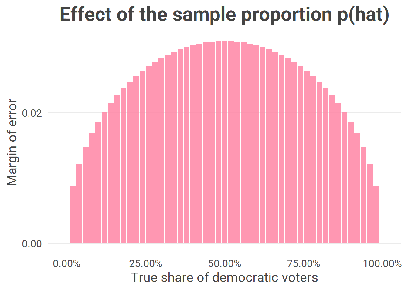 Now we pretend we are a pollster and that we don’t know the true share of democratic voters. Therefore we draw a random sample of 1000 people from our artificial population, calculate the percentage of people who vote for the Democratic party, and since we are an excellent pollster we know that our polling is perfect with no sampling bias: