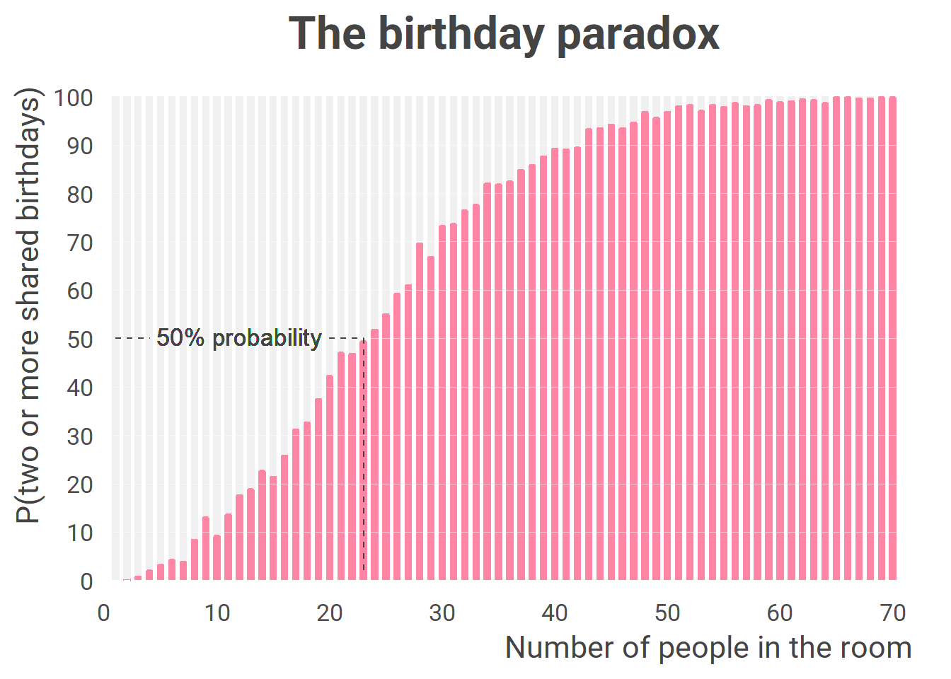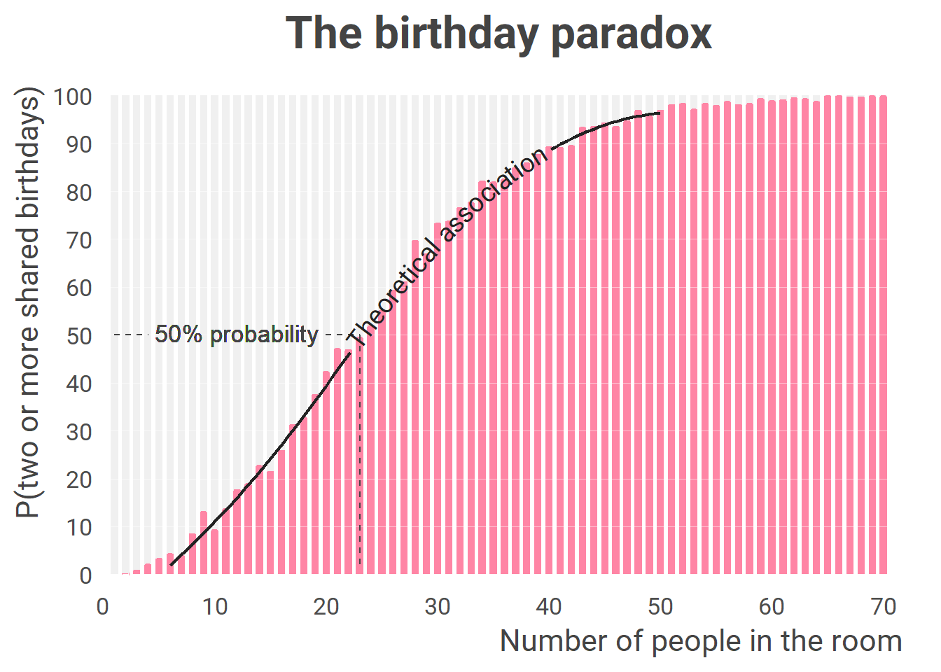 This problem can be solved using probability math. To me, this was always abstract, and the formulas never really made sense to me. Heiss shows that you can actually this probability using simulations in R. I’m pretty sure my university professors never explained this to me explicitly. Now, in hindsight, I wonder why I, myself, have not thought of this before.