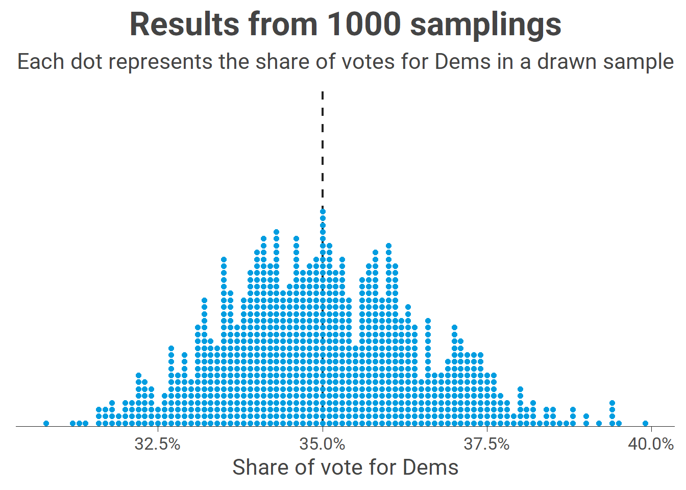 We loop over the the 1000 sample draws, each time storing the % of people who say they will vote for Dems:
