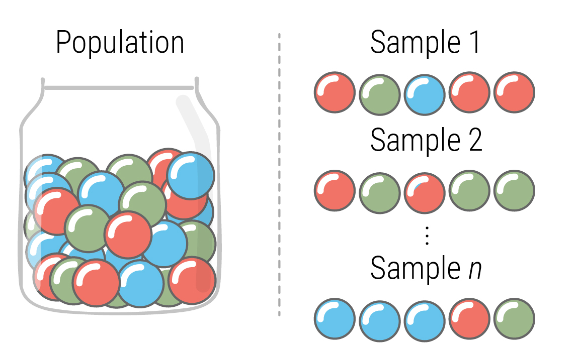 How reliable is a poll? How was the polling conducted? By calling landline phones? Asking random people on Bluesky or people taking the subway during the rush hour? Certainly, these samples will capture different parts of the population, which can lead to biased estimates. If we had infinite time and resources, we could sample everyone. Then we would know the true value of the population parameter (here, the share of votes). This is not possible, of course, so we rather draw one or several samples from the population to estimate the population parameter and hope we are not too far off. In the current example, for the sake of simplicity, we assume that there is no sampling bias.